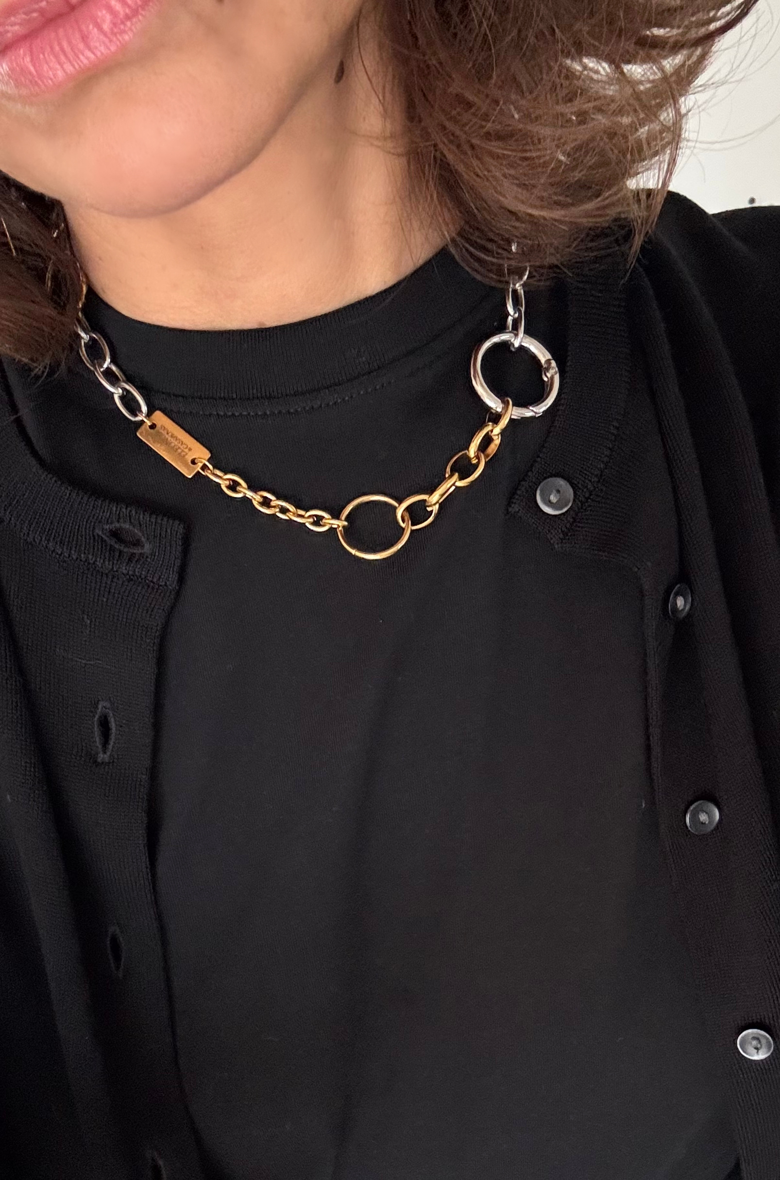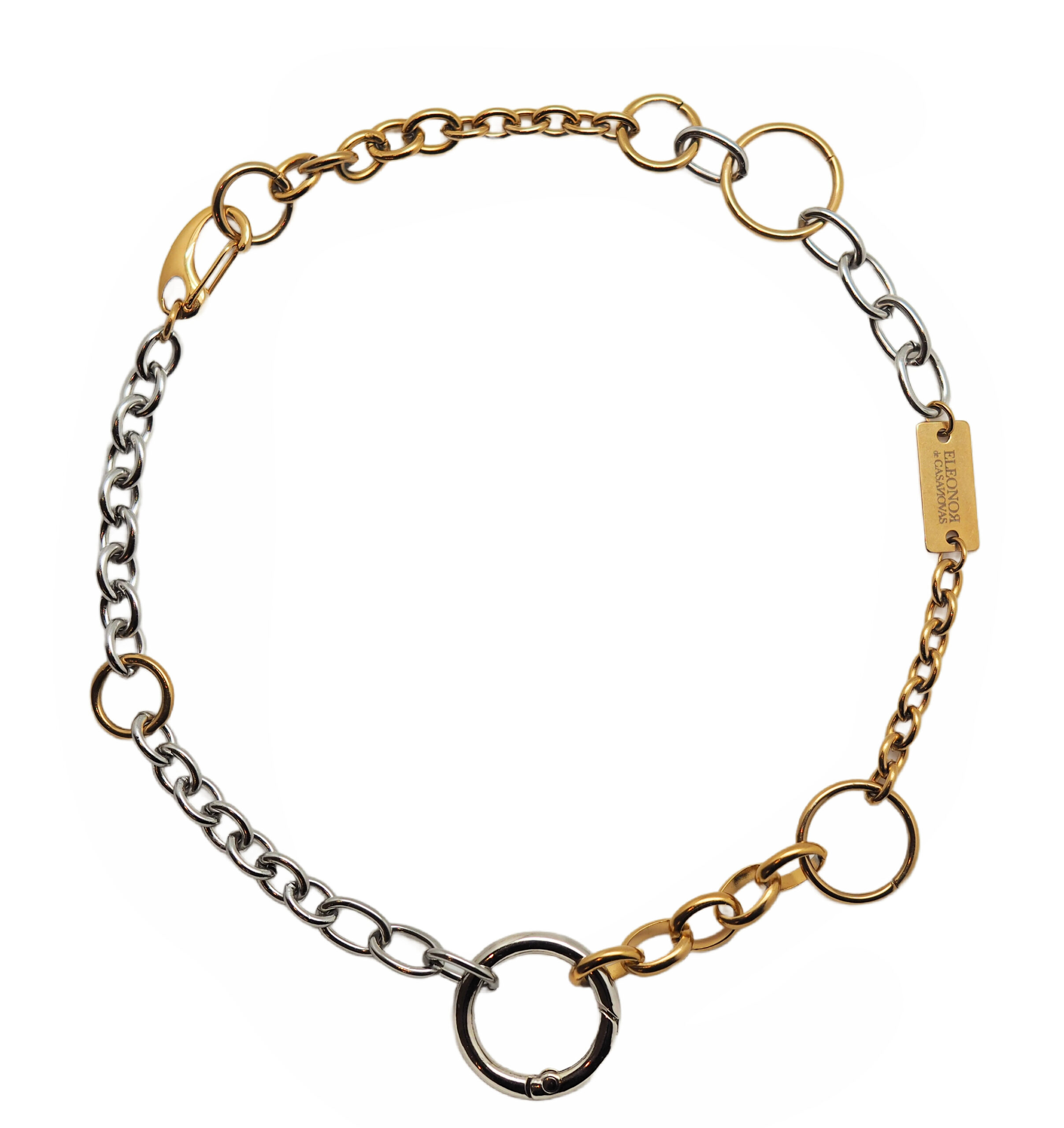 Collar de acero inoxidable bicolor dorado y plateado que combina cadenas y anillas de diferentes formas y tamaños