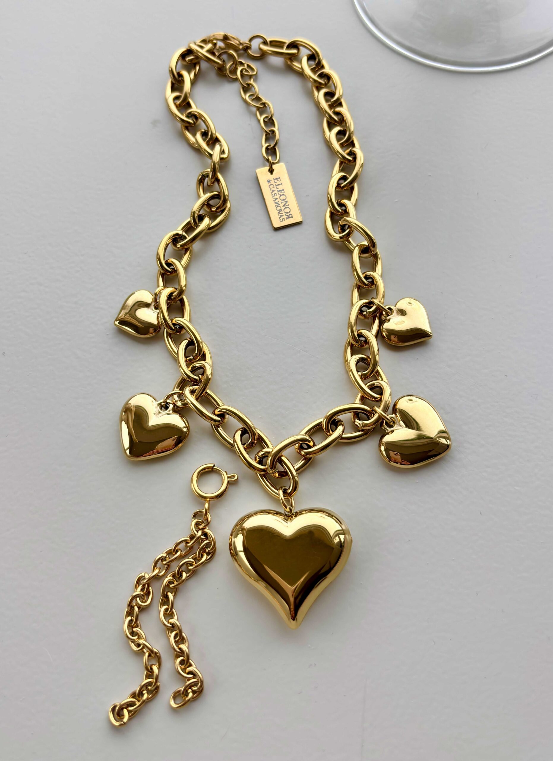 Collar de eslabones de acero inoxidable con 5 corazones y fleco de cadena de “quita y pon”.