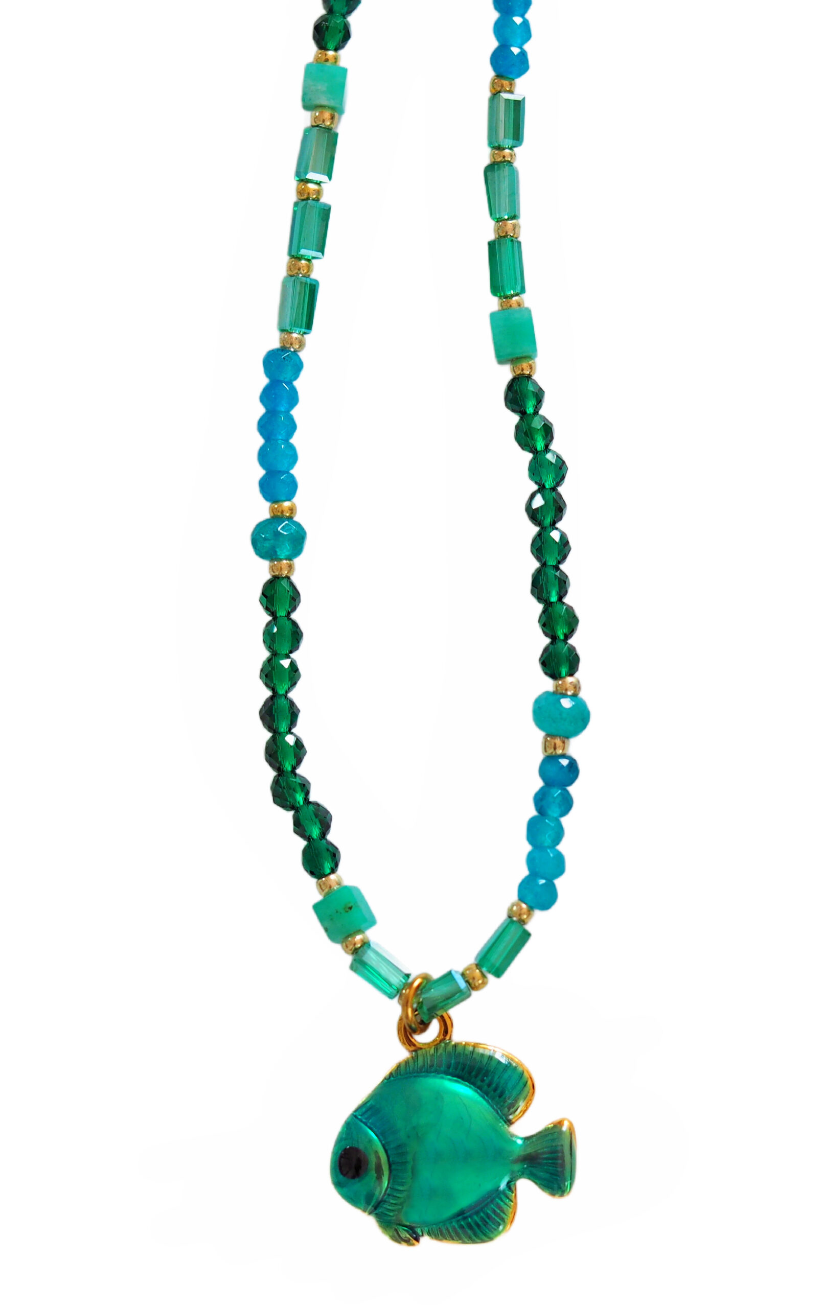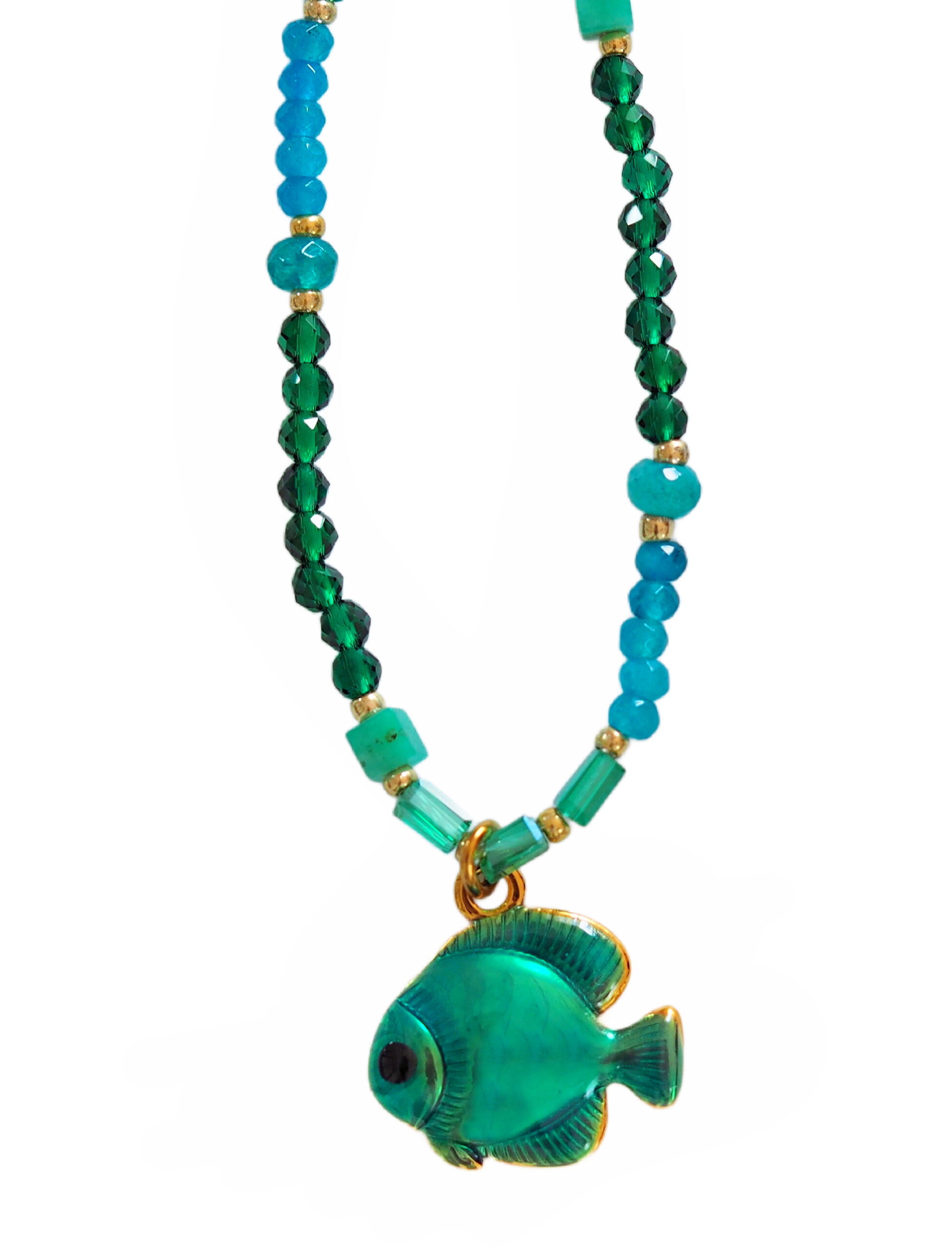 Collar hecho a mano con cuentas de cristal en tonos azules y verdes profundos y pez de acero inoxidable esmaltado en verde