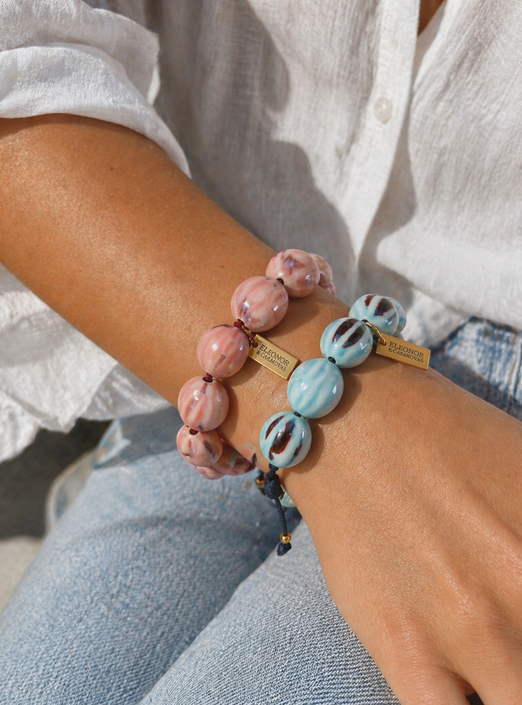 Pulsera ajustable hecha a mano con bolas de cerámica en tonos azul pastel, inspirada en el mar de Saint-Tropez
