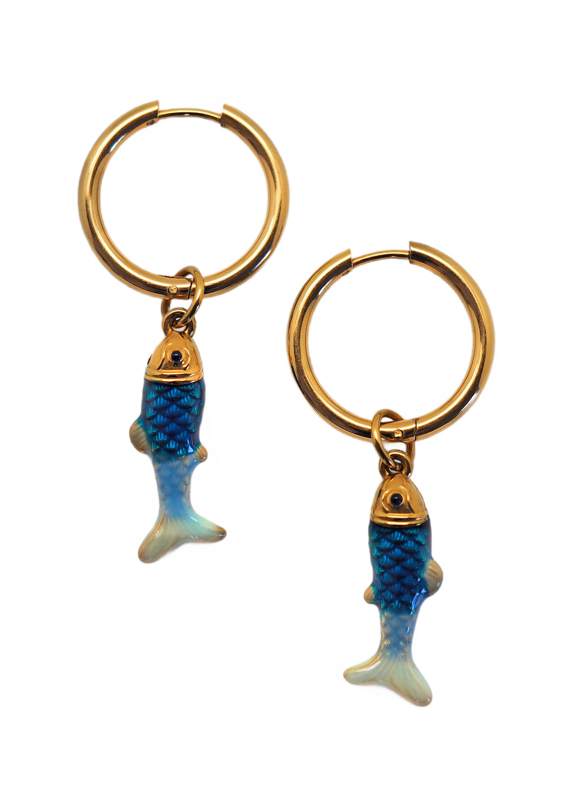 Aros de acero inoxidable chapado en oro con pez esmaltado en preciosos tonos azul y verde agua.